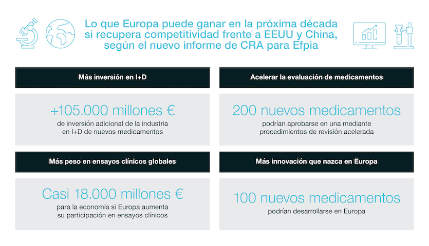 Un nuevo informe de CRA para la Federación de la Industria Farmacéutica Europea (Efpia) explica lo que los europeos tienen por ganar si la región recupera competitividad frente a EEUU y China